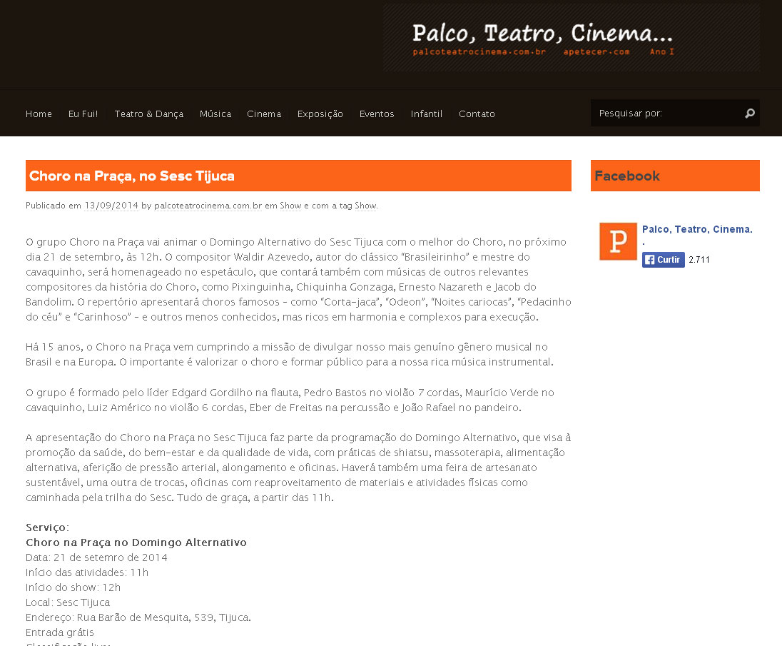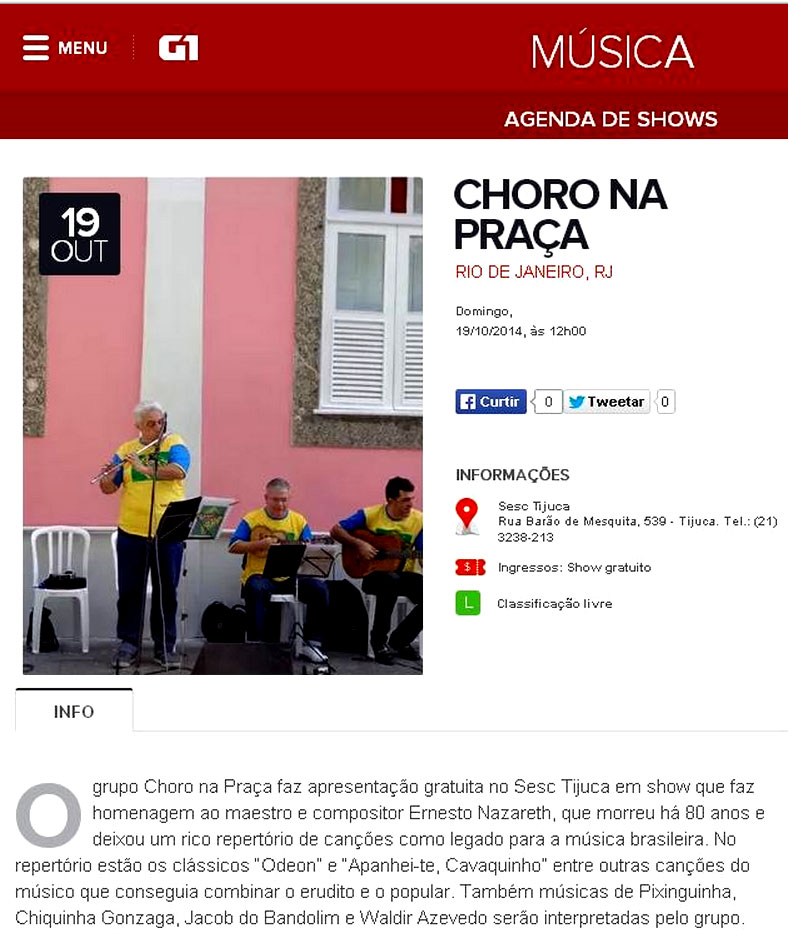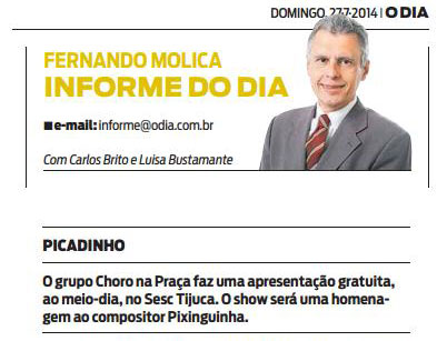 Sesc Tijuca - Rio de Janeiro Matérias publicadas sobre as apresentações da Choro na Praça nos meses de junho, julho, setembro, outubro e novembro de 2014 Edgard Gordilho (flauta), Pedro Bastos (violão 7), Mauricio Verde (cavaquinho), Luiz Américo "Mequinho" (violão) e Eber Freitas (pandeiro) Produção, filmagem e fotos: Carla Paes Leme - Assessoria de imprensa: Sheila Gomes Dois Por Quatro Eventos Artísticos |